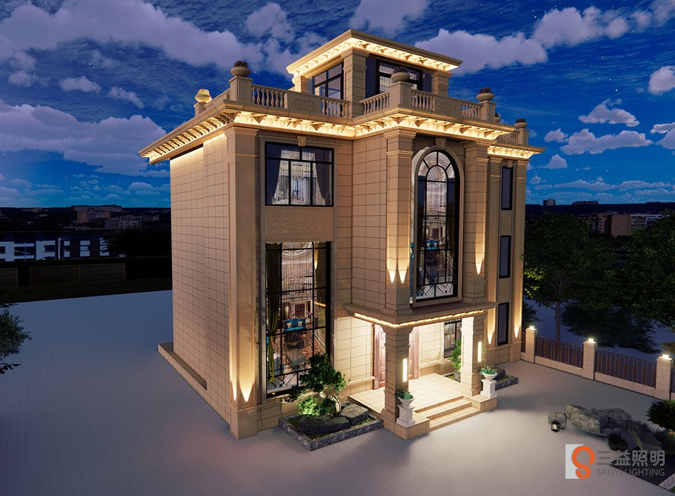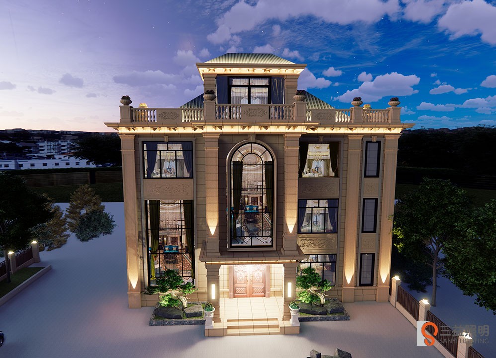 別墅燈光采用3D漫游設(shè)計,燈具采用專業(yè)工程款瓦楞燈、洗墻燈、LED投光燈、定制柱頭燈、壁燈、草坪燈等,整體燈光營造浪漫、溫馨的環(huán)境。